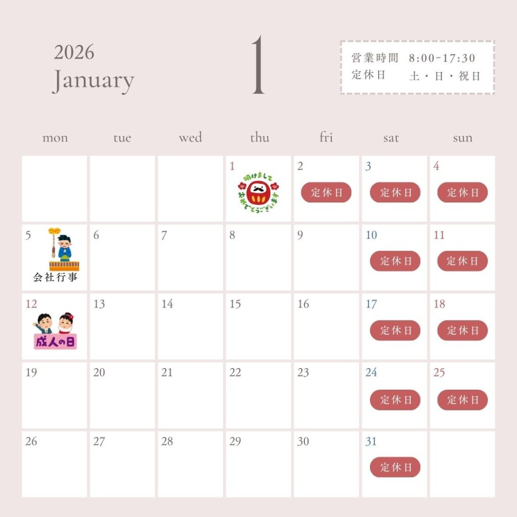 TOP お知らせ・スタッフブログ 2026年1月営業カレンダー News お知らせ Staff Blog ちょこっと日記 Staff Blog 山内よちよち日記 Staff Blog こうちゃんの日常 2026.01.01 2026年1月営業カレンダー ちょこっと日記 おはようございます✨今日から2026年のスタートですね🎍😊2026年もより一層気合いを入れて頑張りたいと思います! 今年もよろしくお願いいたします🙇♀️ 前の記事へ 一覧へ戻る